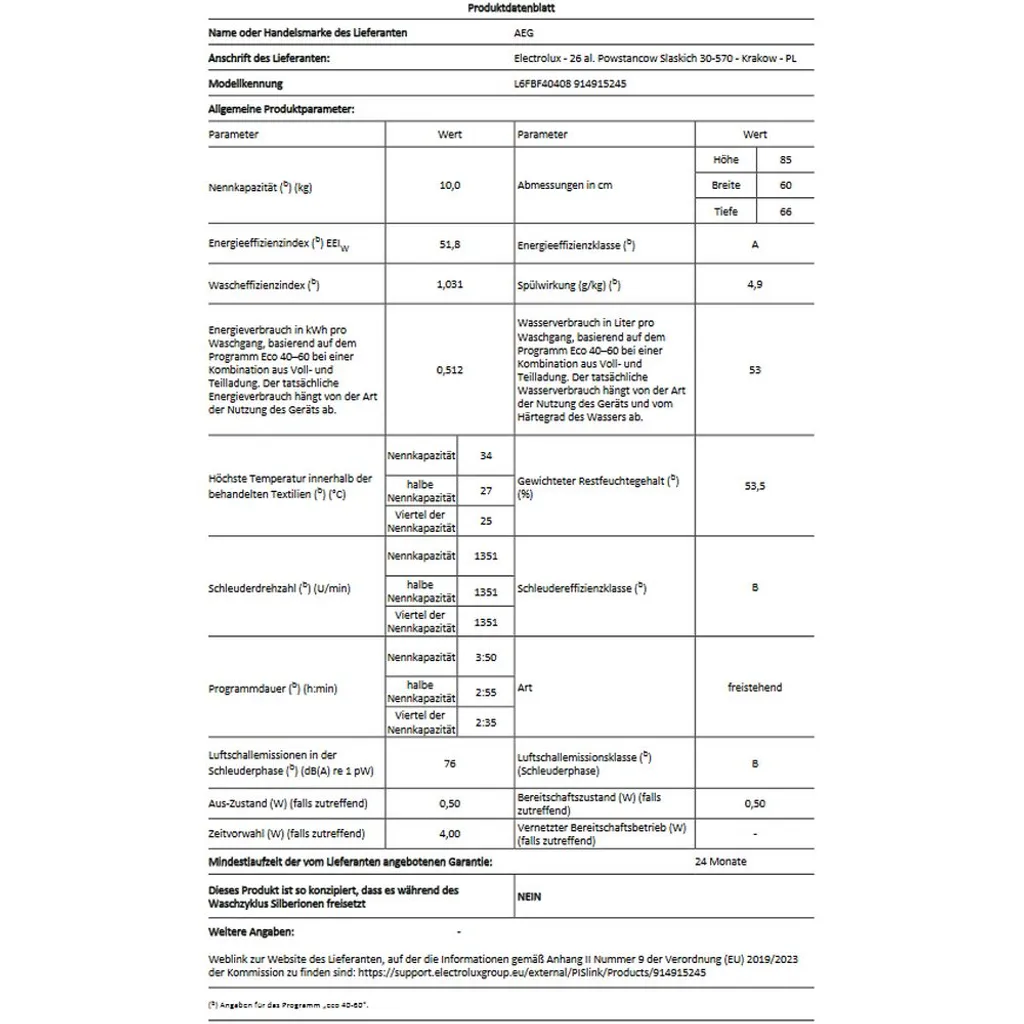 AEG – L6FBF40408 – Waschmaschine – 10 Kg