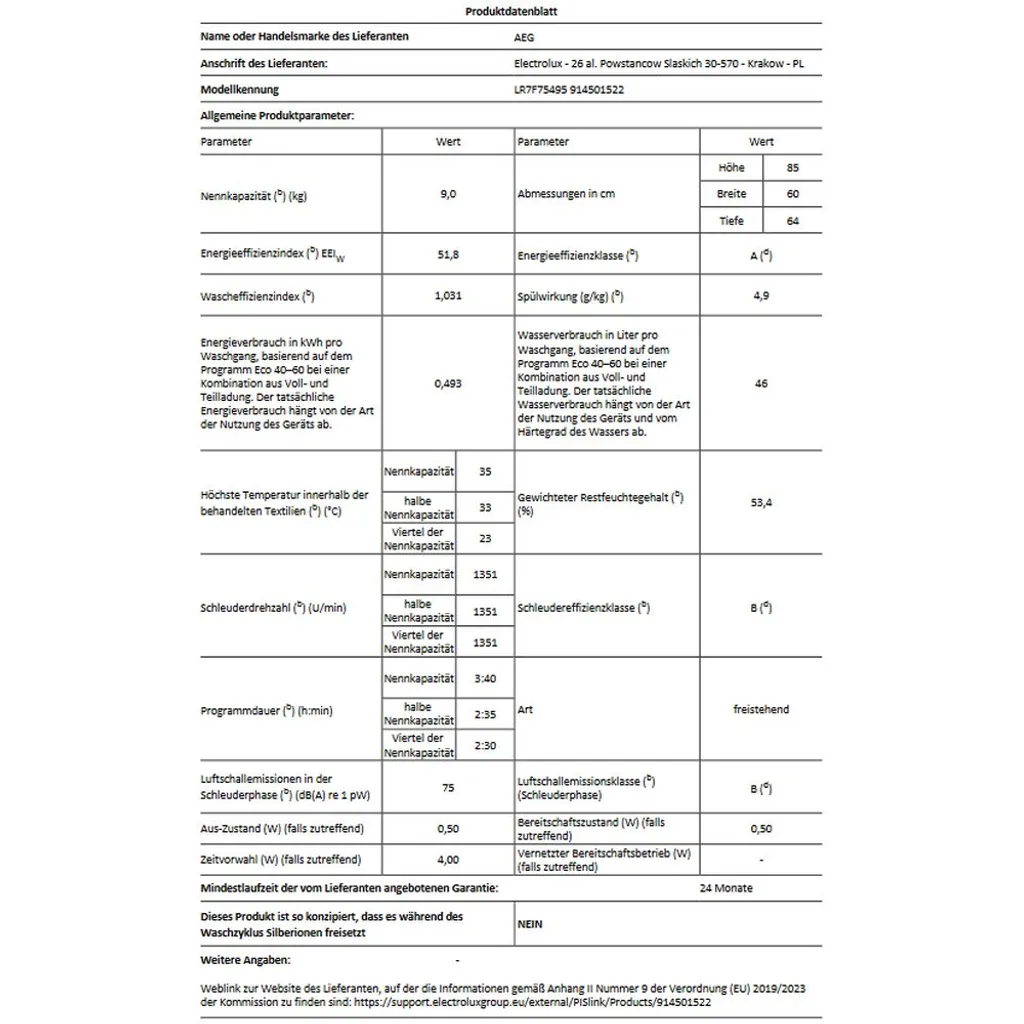 AEG – LR7F75495 – Waschmaschine – 9 Kg
