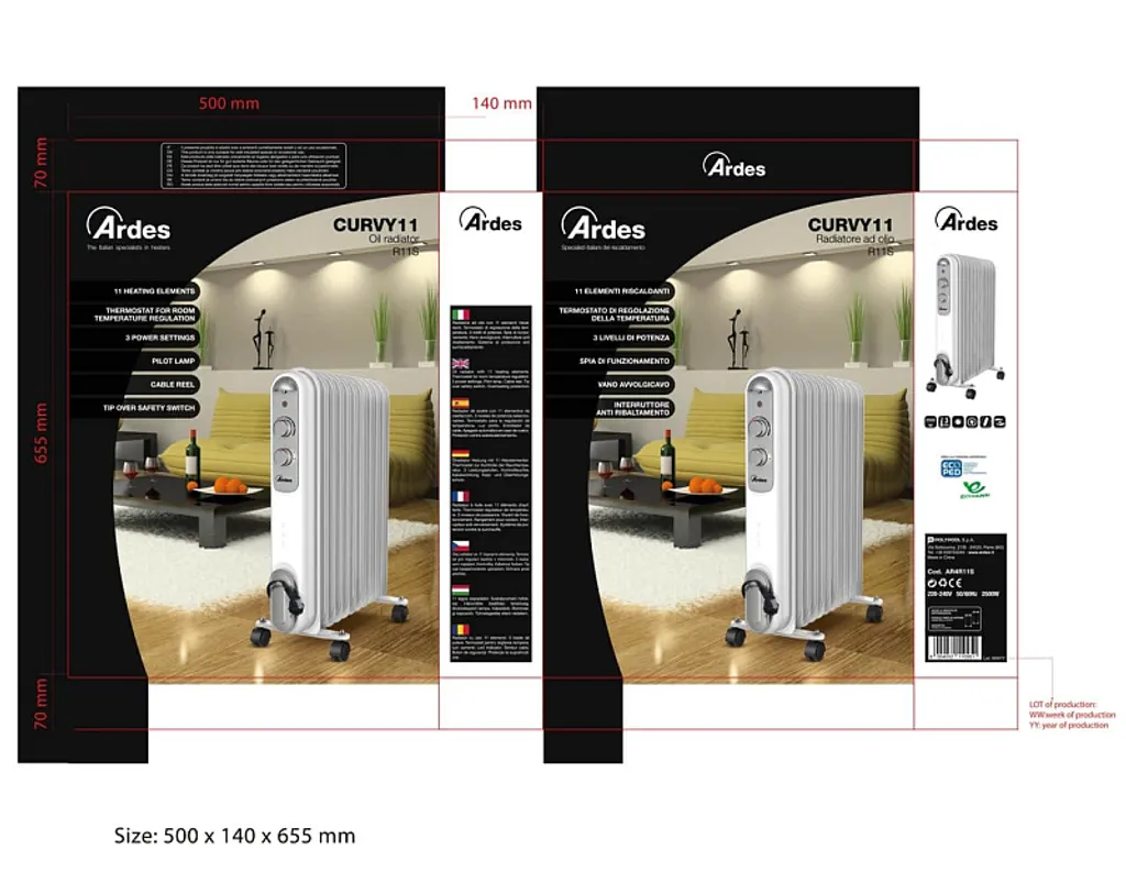 Ardes AR4R11S CURVY 11 Ölheizkörper, 11 Heizelemente, 3 Kräfte, 2500 W, Silber