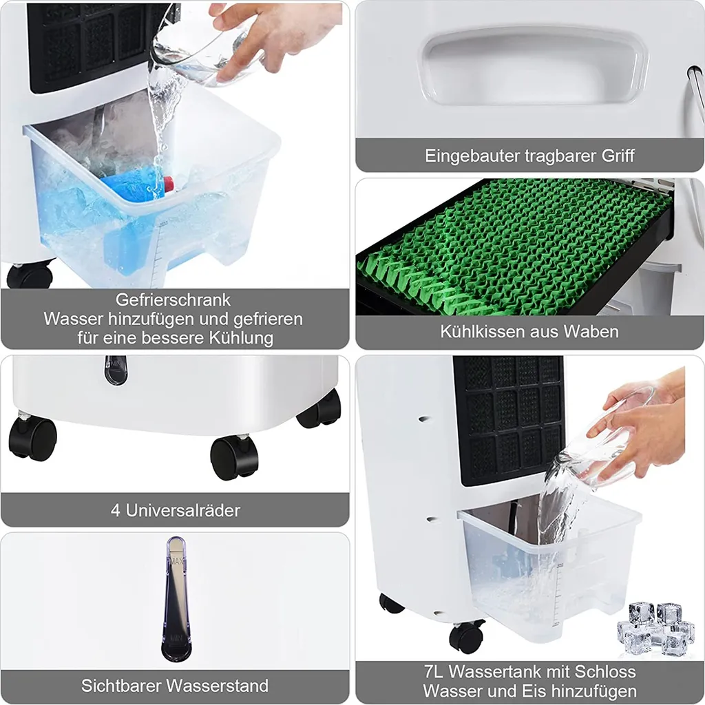 COSTWAY 4in1 Mobile Klimaanlage 65W, 3 Stufen Klimagerät 7L Tank, Inkl. 7,5H Timer, Fernbedienung & 2 Kühlakkus, Luftbefeuchter, Luftreiniger, Ventilator, Luftkühler, Aircooler