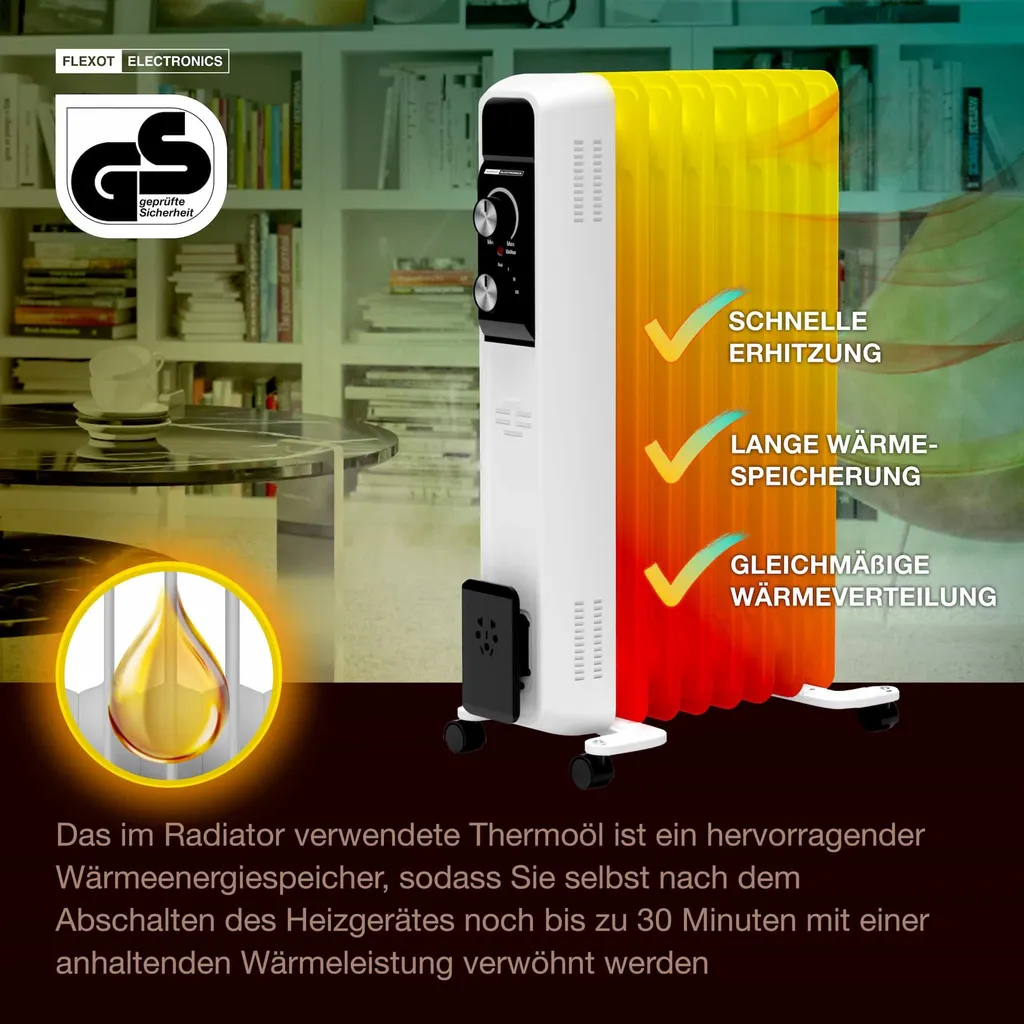 Flexot® Ölradiator 600W / 900W / 1500W – 3 Powerstufen 7 Rippen Elektroheizung Heizung Heizer Heater Radiator Überhitzungsschutz Thermostat Kabelaufwicklung Heizgerät Radiator