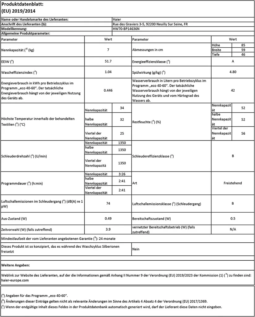 Haier HW 70 BP 14636 N, Frontlader, 7 Kg, B, 75 DB, 1400 RPM, A