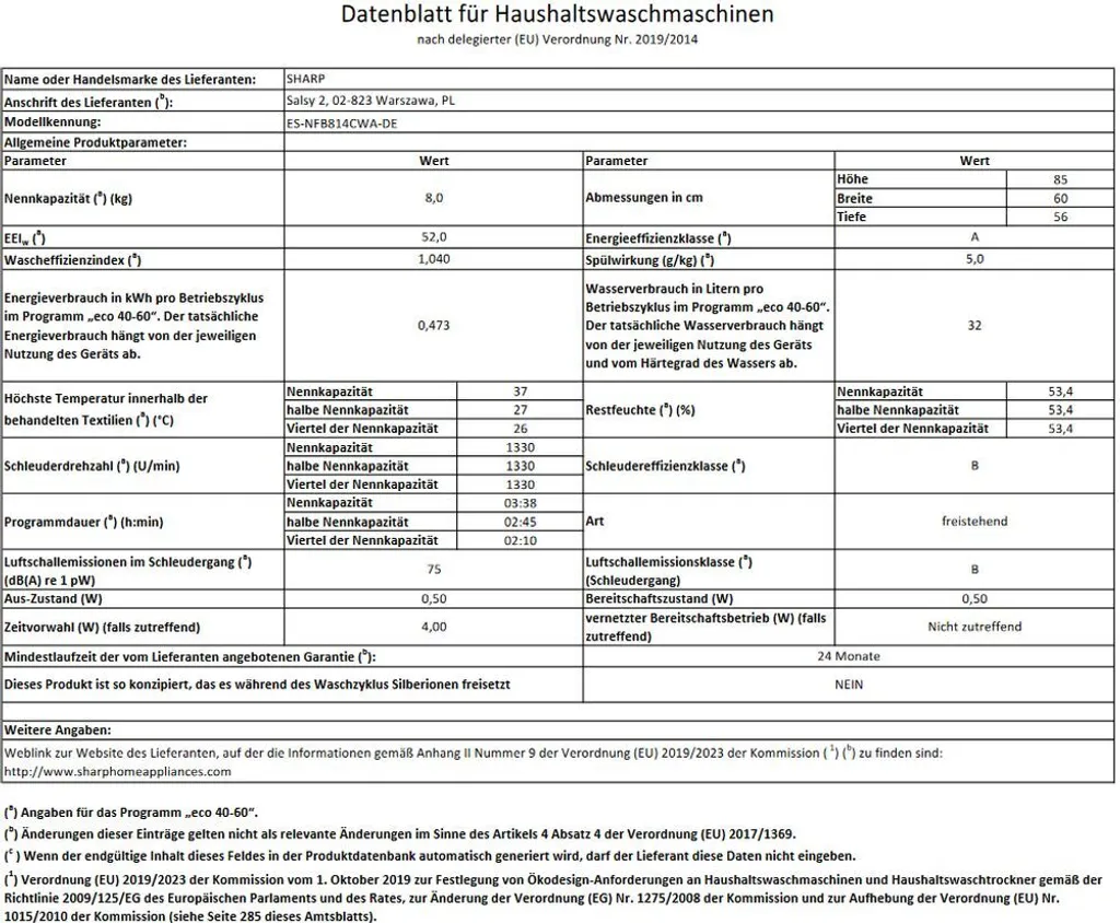 Sharp ES-NFB814CWA-DE Waschmaschine 8kg 1400 U/min