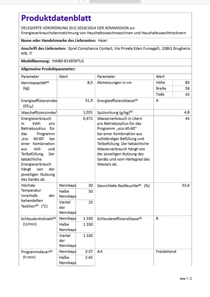 Waschmaschine Frontlader 8kg XL HOn App Haier HW80-B14959TU1