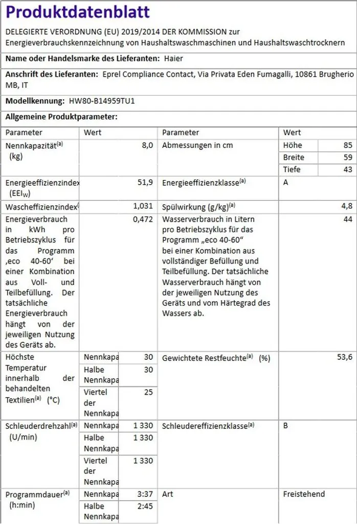Schreibe die erste Rezension für „Waschmaschine Frontlader 8kg XL HOn App Haier HW80-B14959TU1“ Antwort abbrechen